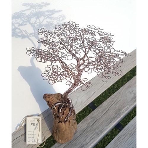 Arbre d'une jolie couleur beige rosé très douce, enraciné au sommet d'un morceau de bois élancé tel un éperon rocheux. Une jolie sculpture élancée aux boules ovales ajourées.