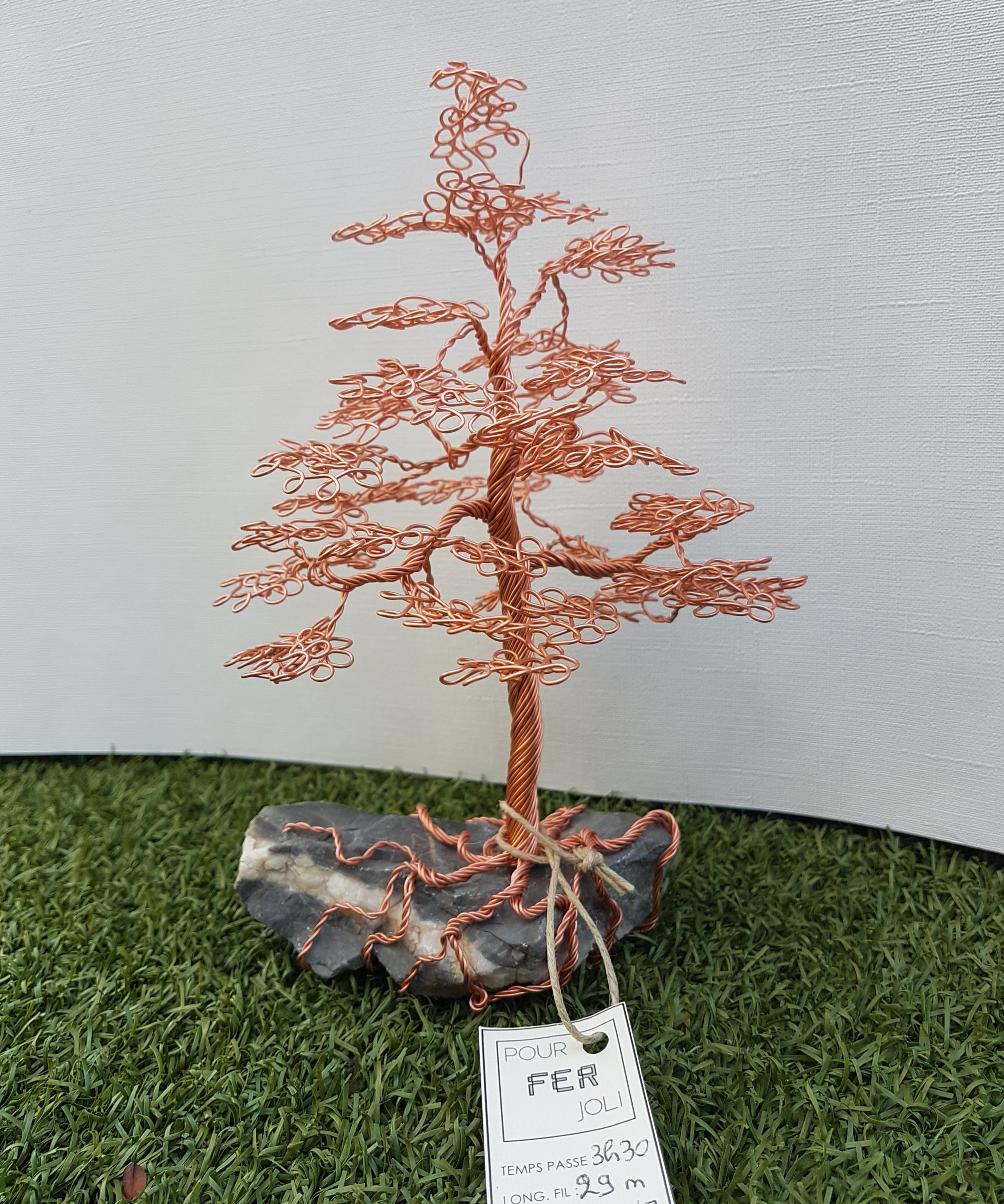 Un conifère bien droit, et bien fier d'être installé sur un si joli granit gris veiné de blanc. Sa couleur telle de l'or rose met bien en valeur ses racines torturées qui emprisonnent le caillou bicolore.