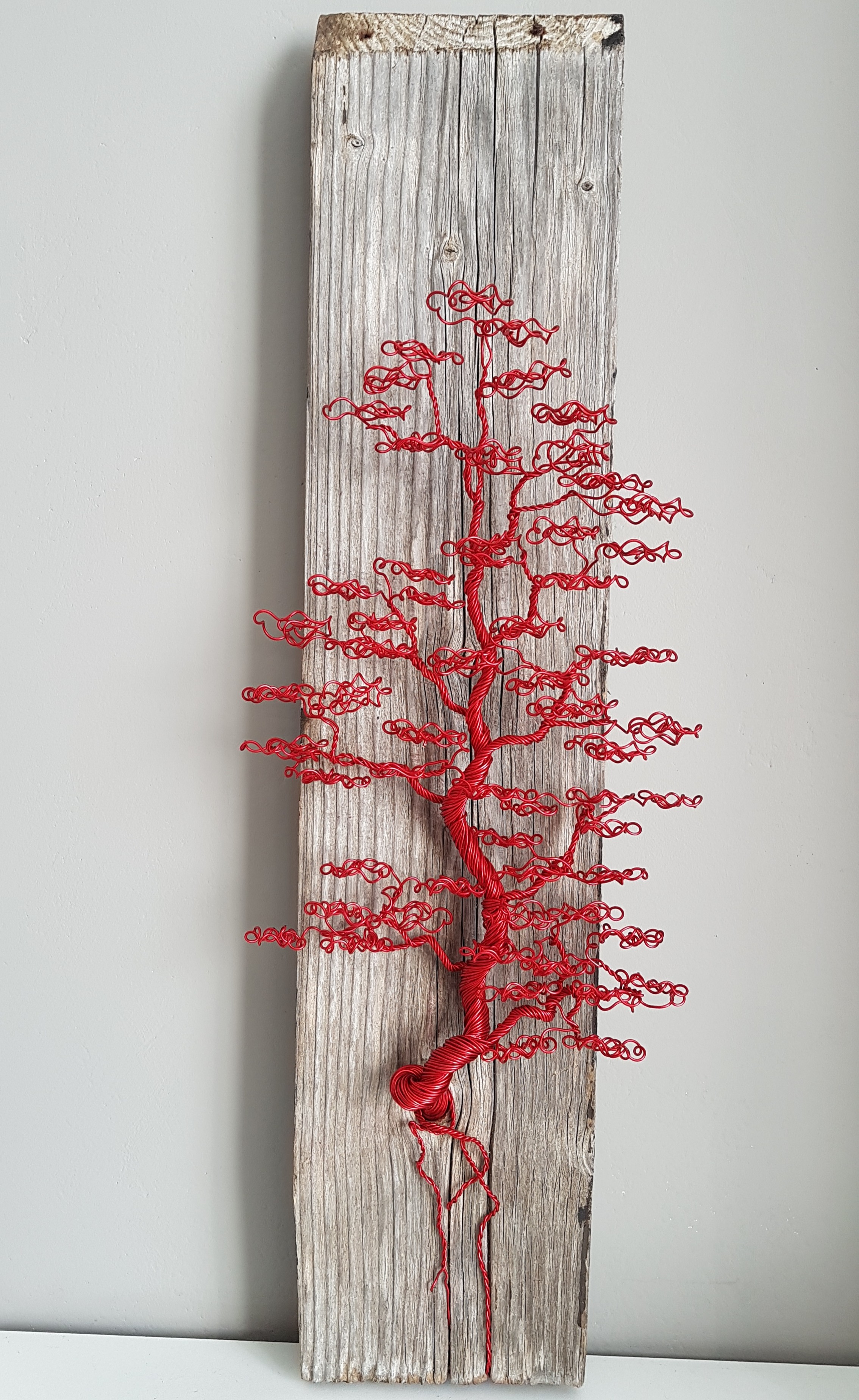 Comme s'il avait poussé là par hasard. D'une jolie couleur rouge vif, et installé sur une vraie vieille planche, devenue grise avec les aléas du temps.