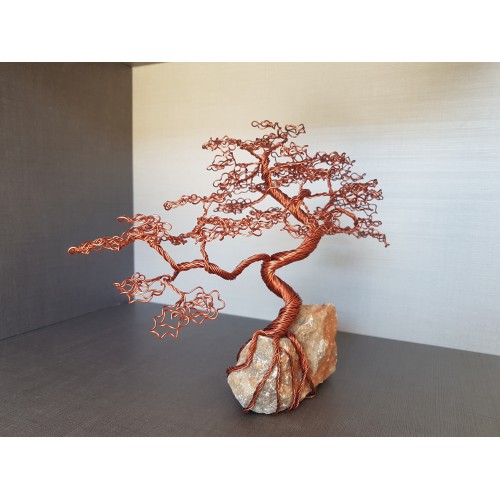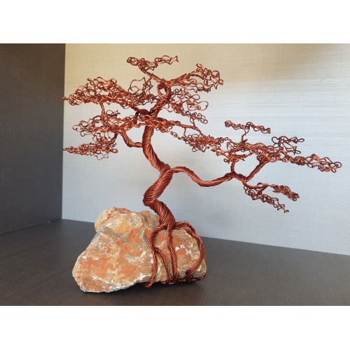 Bonsaï brun noisette aux branches et racines torturées, enraciné sur un caillou brut en camaïeu de couleurs chaudes brun terra cota.