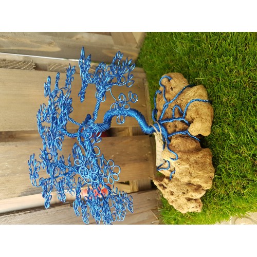 Beaucoup de peps pour ce bonsaï bleu roi aux boucles ovales irrégulières. Enraciné dans les recoins d'un morceau de liège flotté très graphique.
