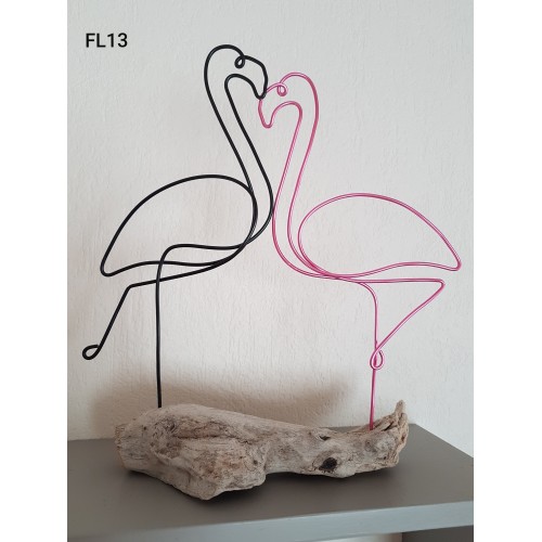Couple de flamants roses sur un morceau de bois flotté naturel naturel.
