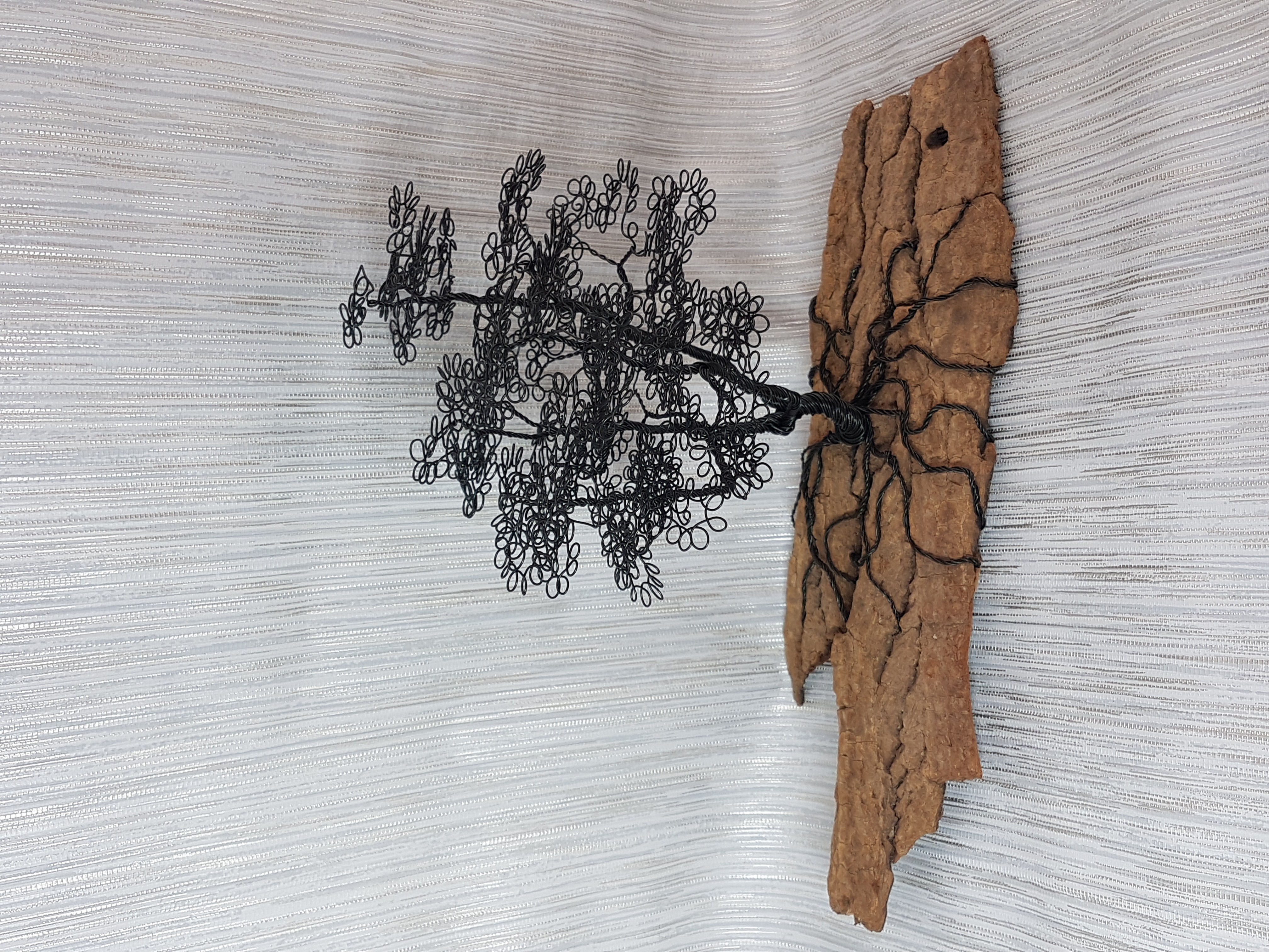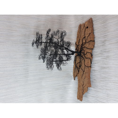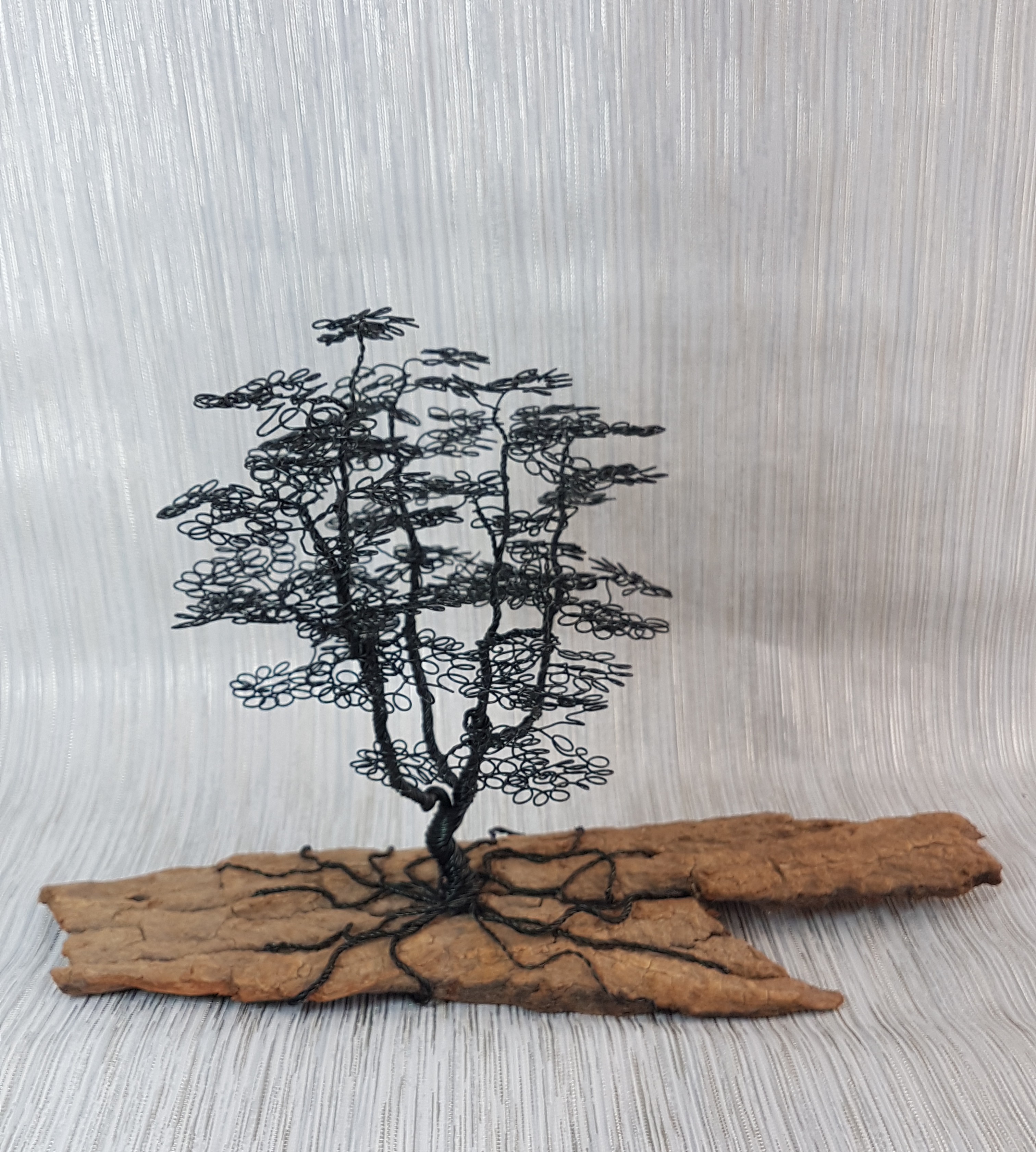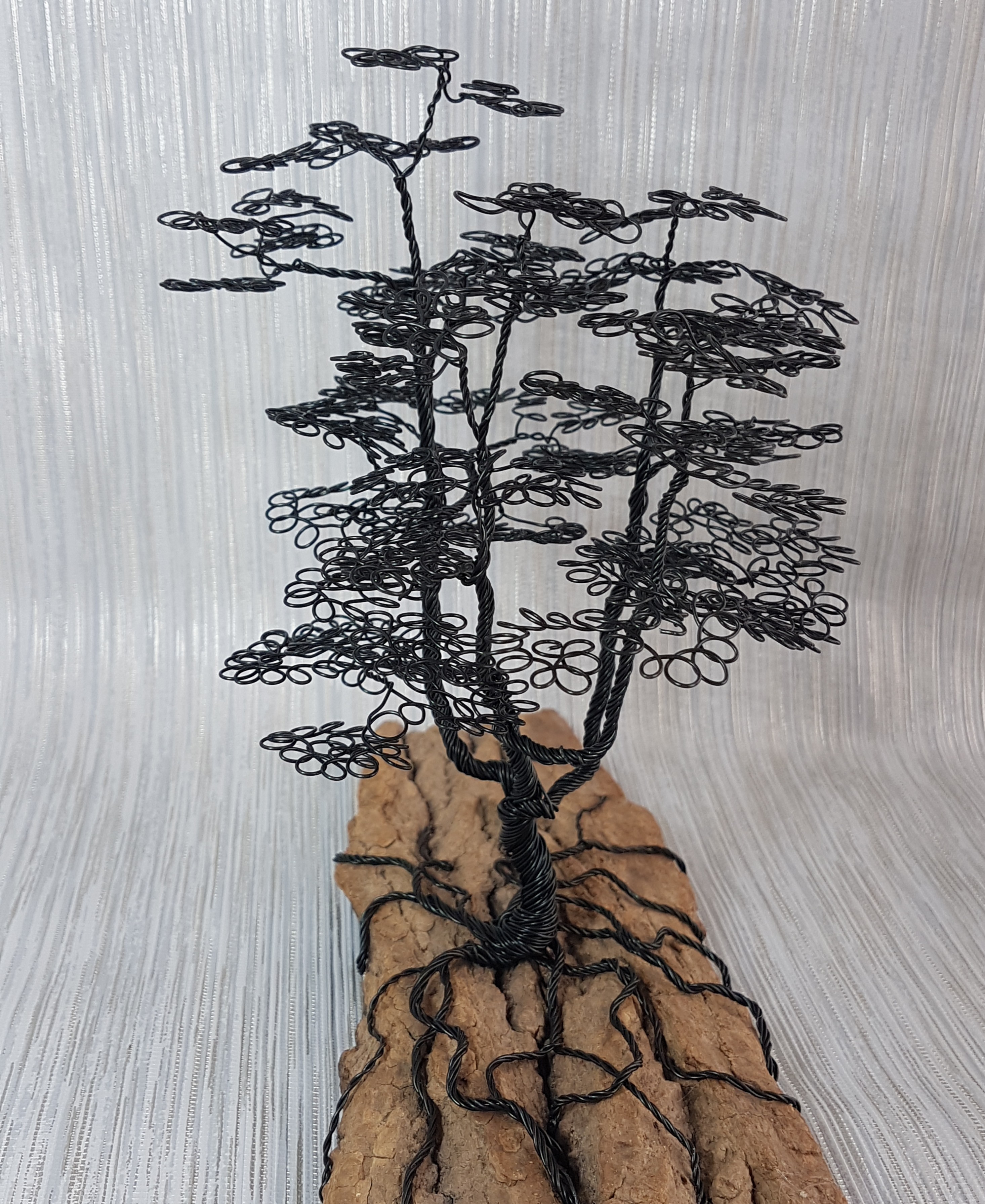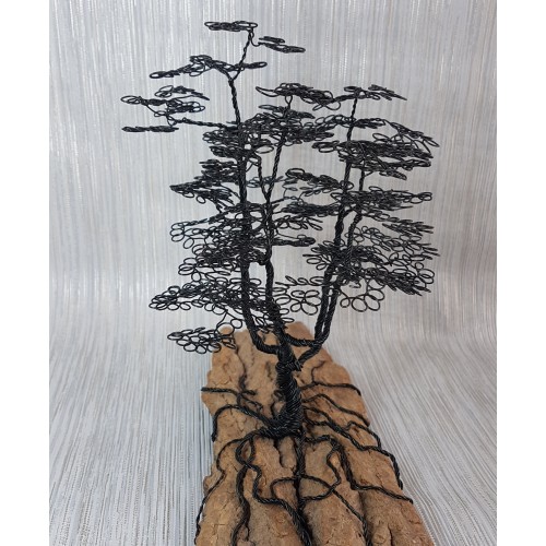 Un bel arbre original dont les branches principales sont très verticales. L'ensemble du feuillage est constitué de belles boucles ovales légèrement irrégulières, assez compactes et fournies. Ses racines s'étalent sur un grand morceau de bois flotté naturel très plat : une écorse aux nombreux reliefs esthétiques.