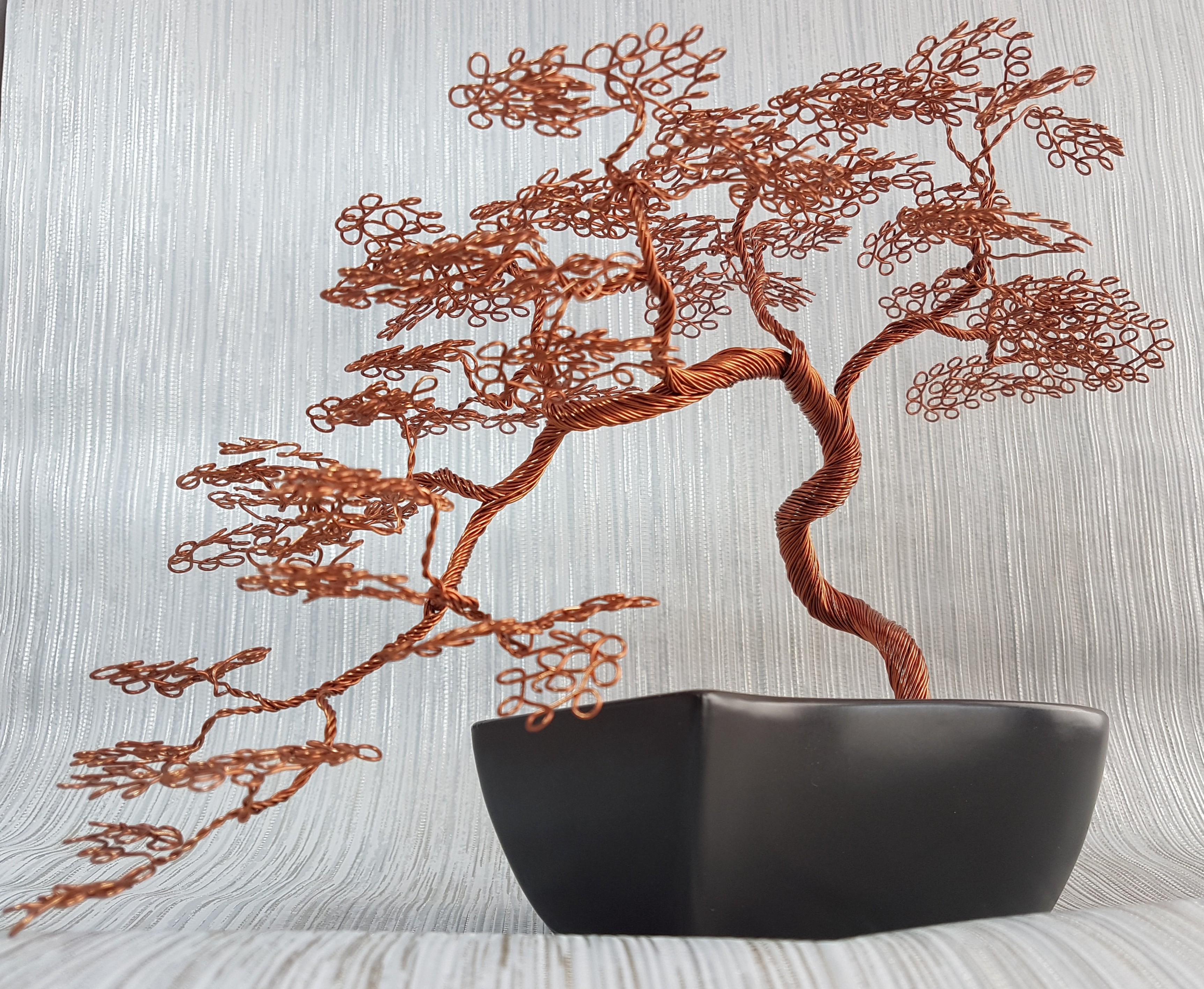 Un beau bonsaï plein de petites boucles rondes sur ses branches tordues qui descendent en cascade sur le tronc penché.
