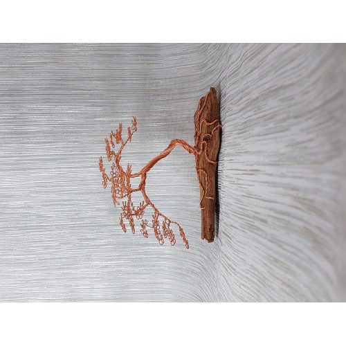Des jolies couleurs chaudes pour un camaïeu de couleurs orangées pour l'arbre penché et son bois flotté arrondi, usé finement par veines de bois.