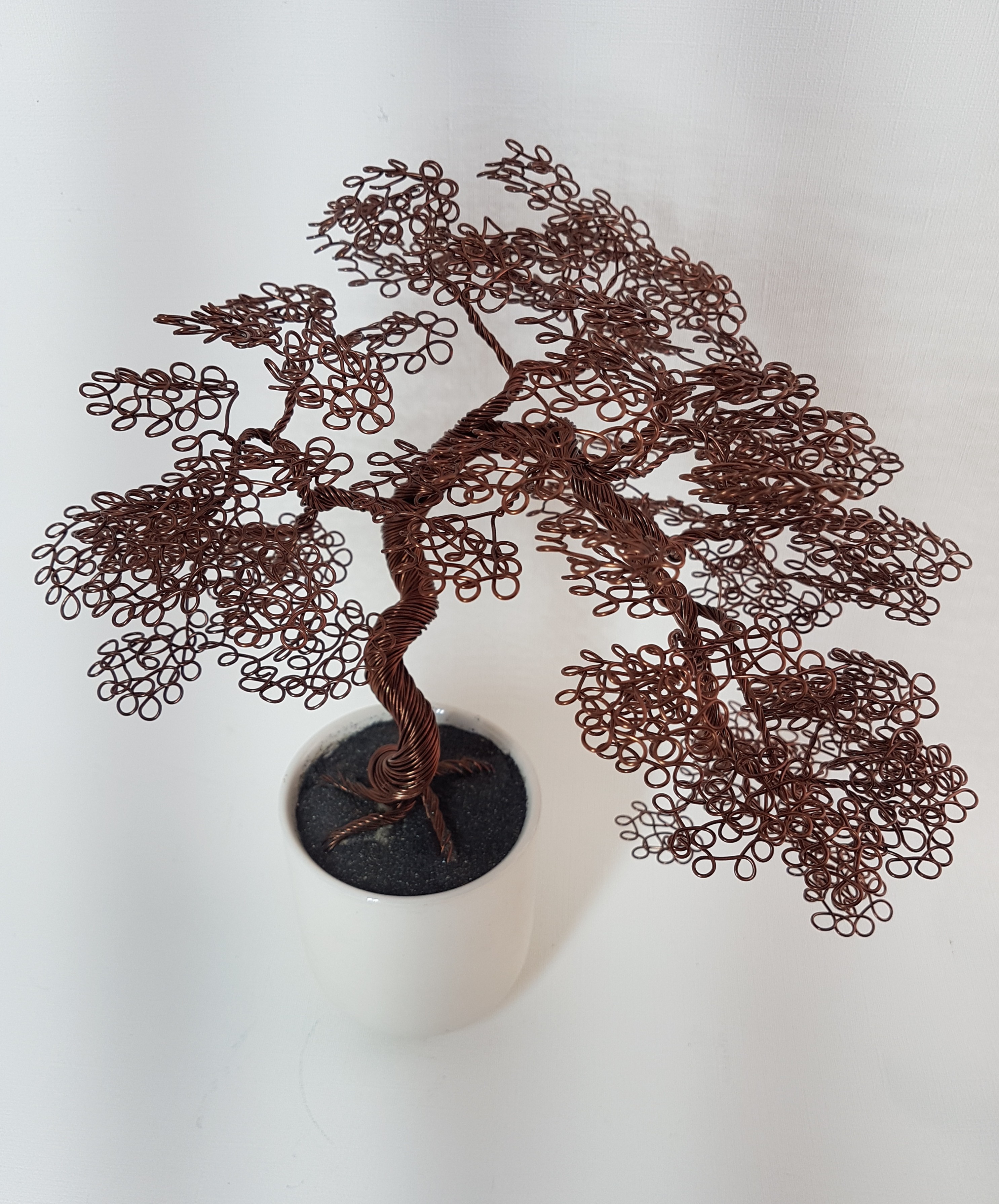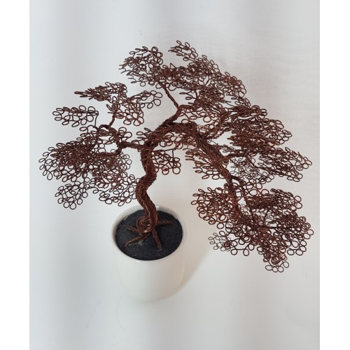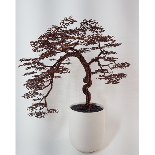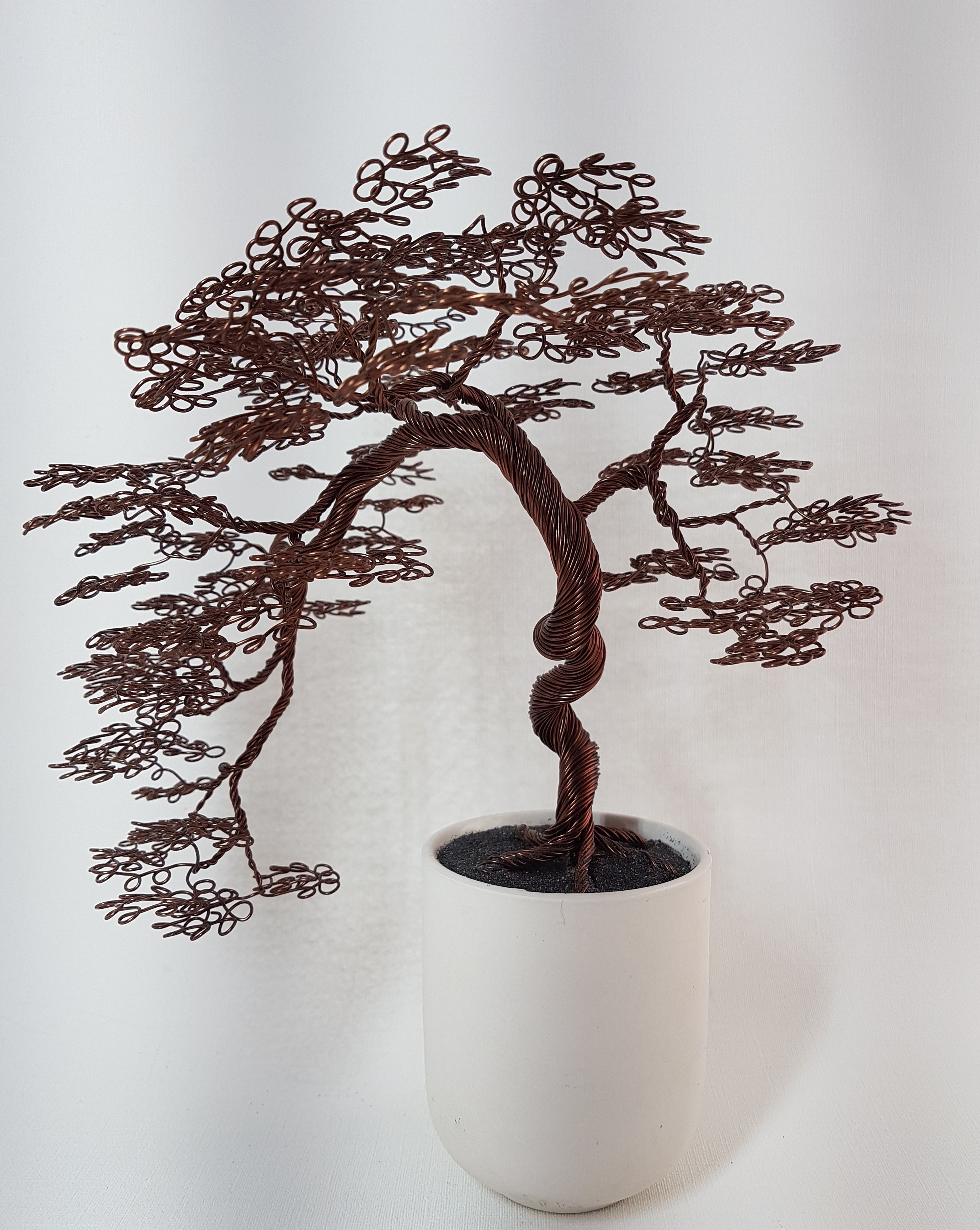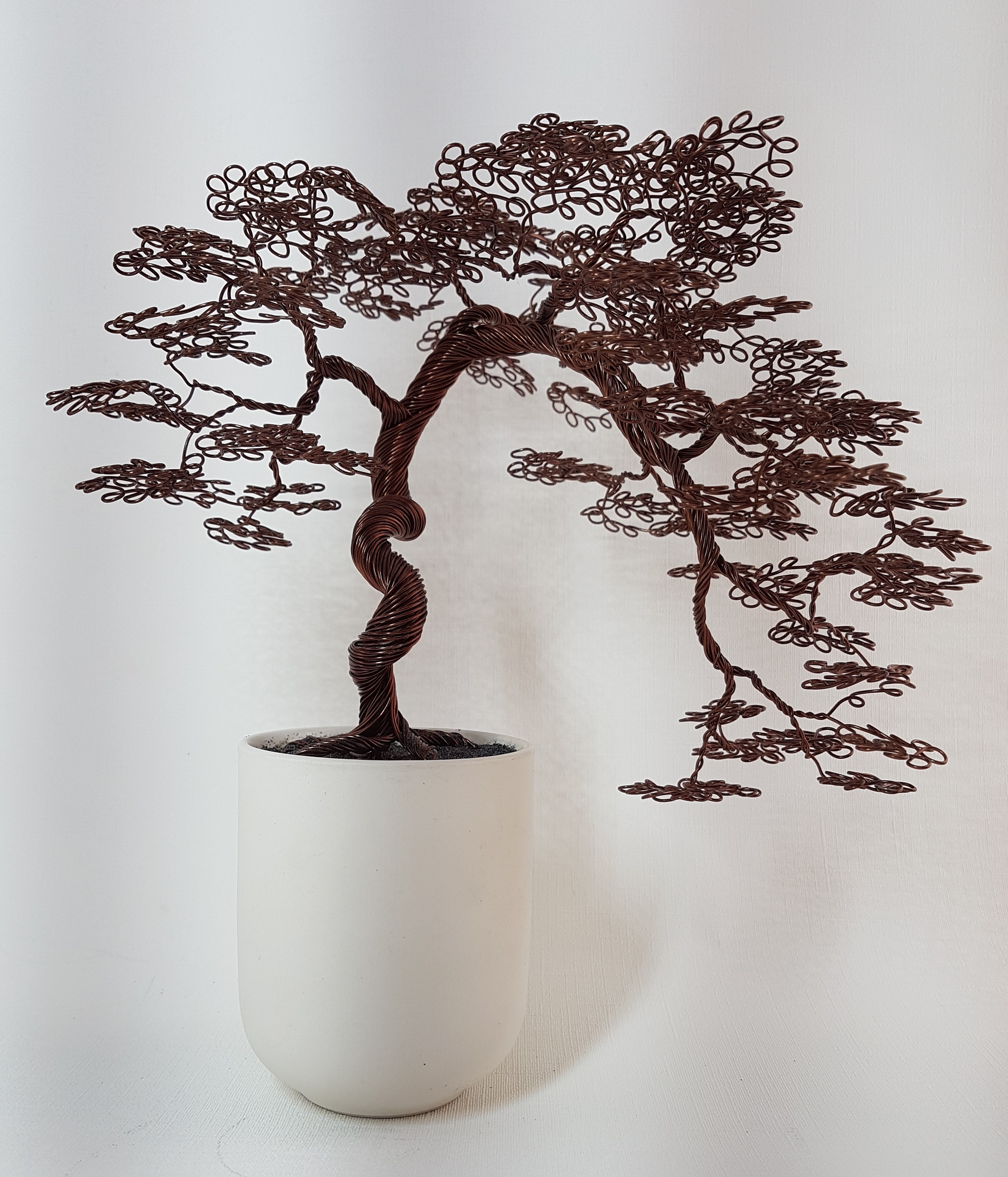 Un bonsaï brun chocolat, aux très nombreuses boucles rondes et régulières. En forme retombante, dans un pot de céramique blanc mât.