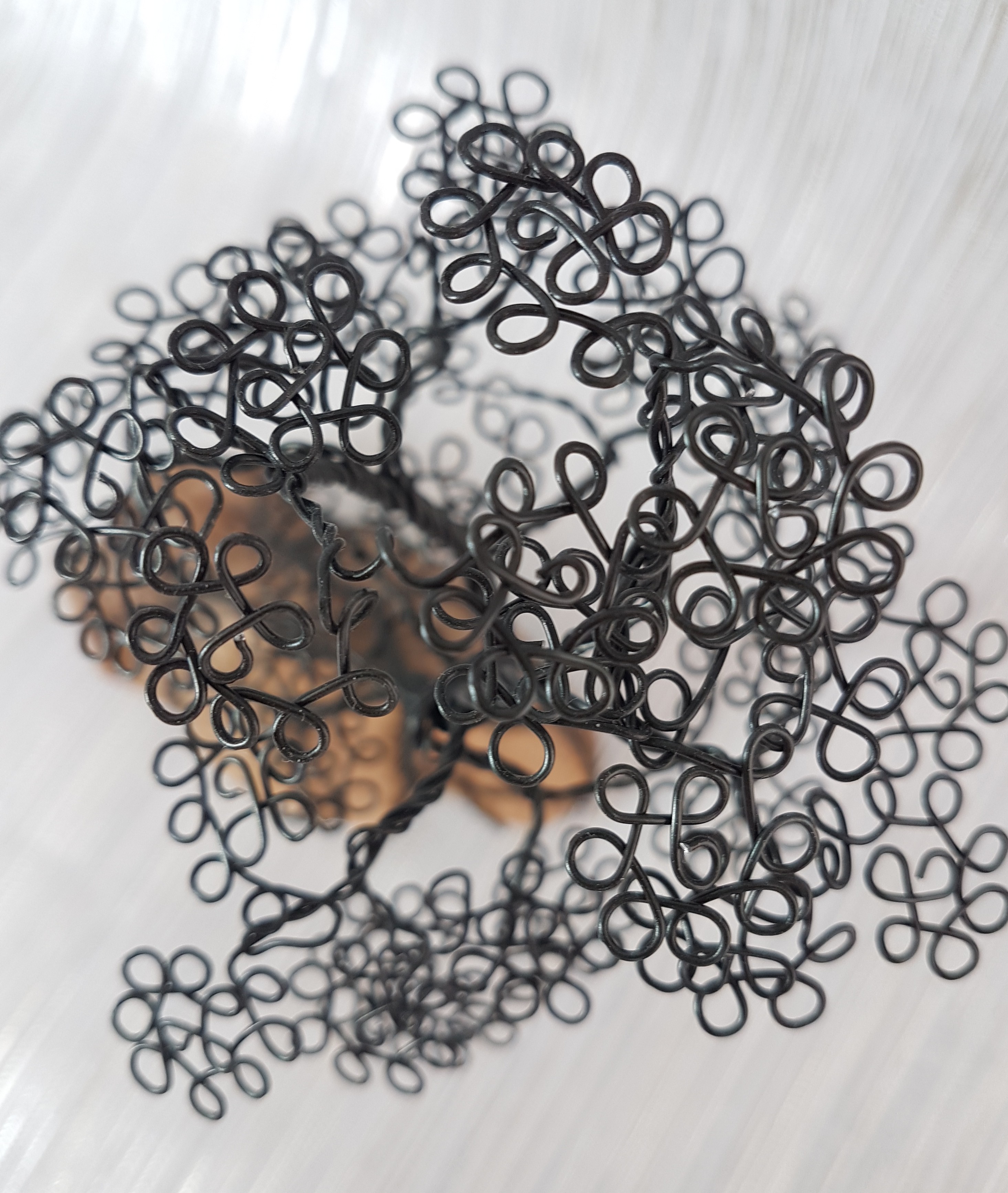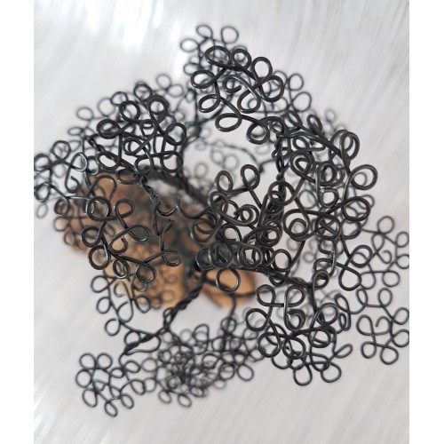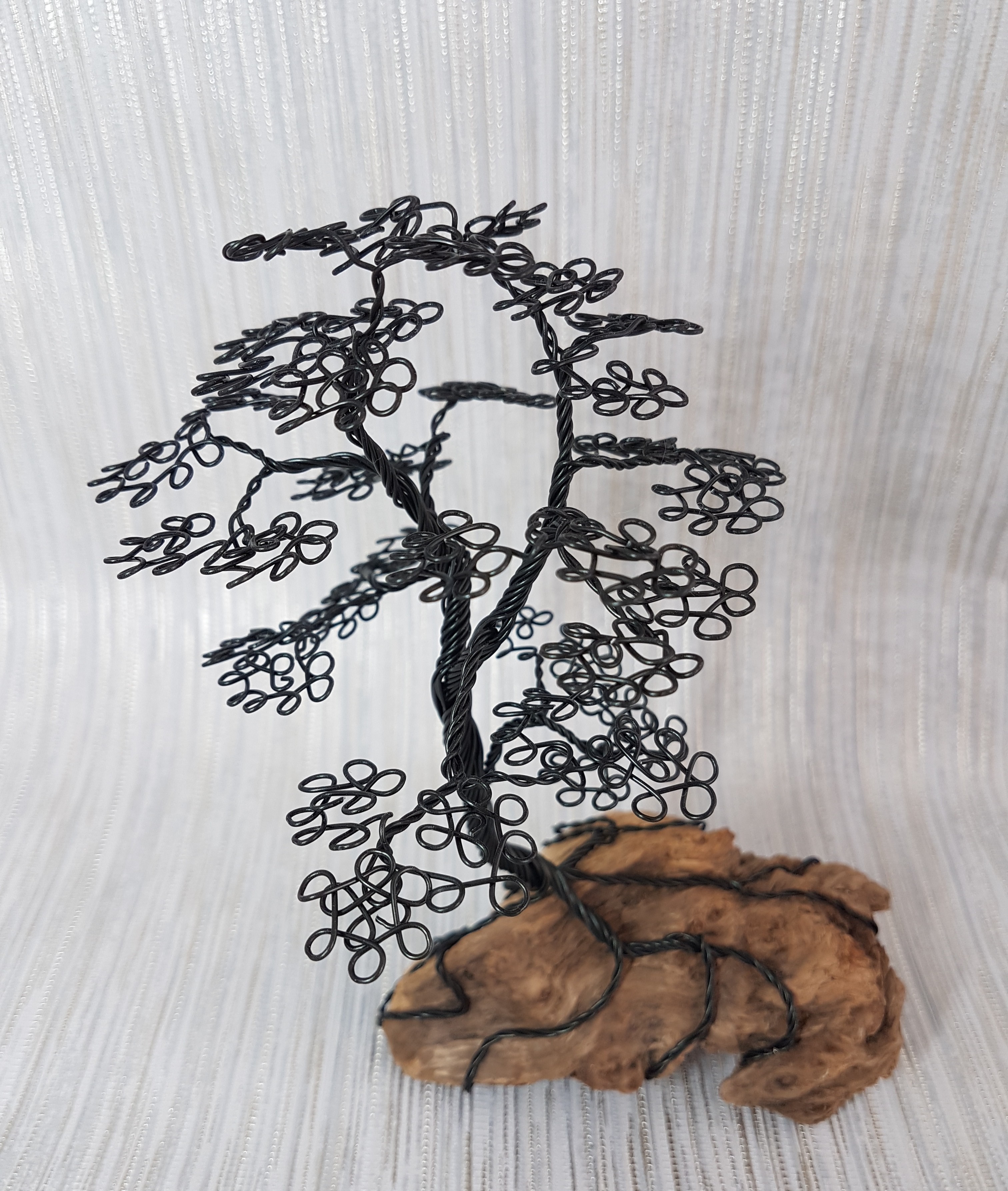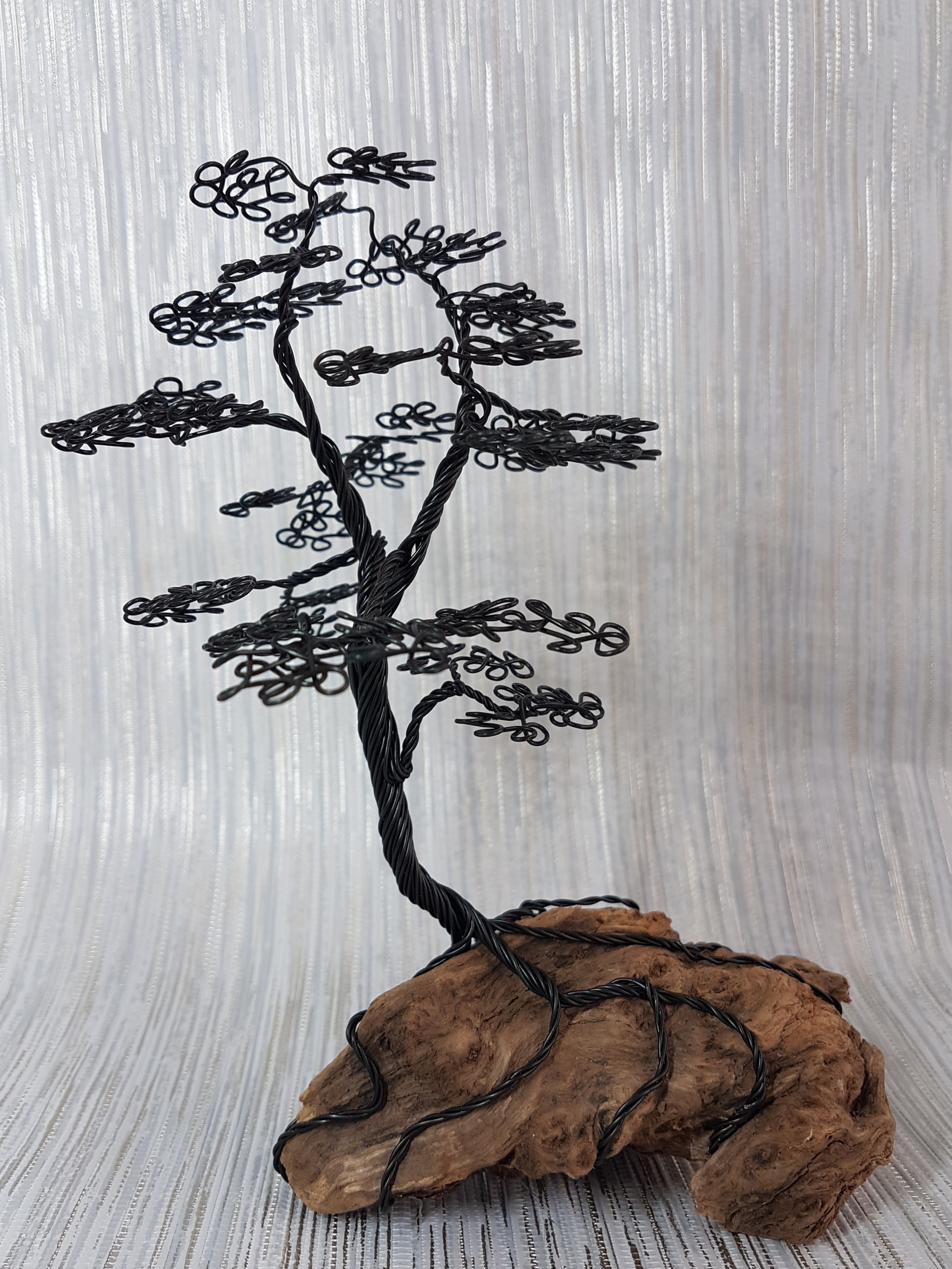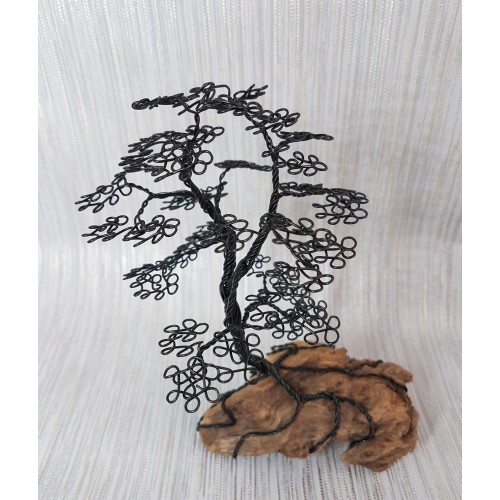 Fil noir satiné et boucles rondes. Support de bois flotté naturel brun.