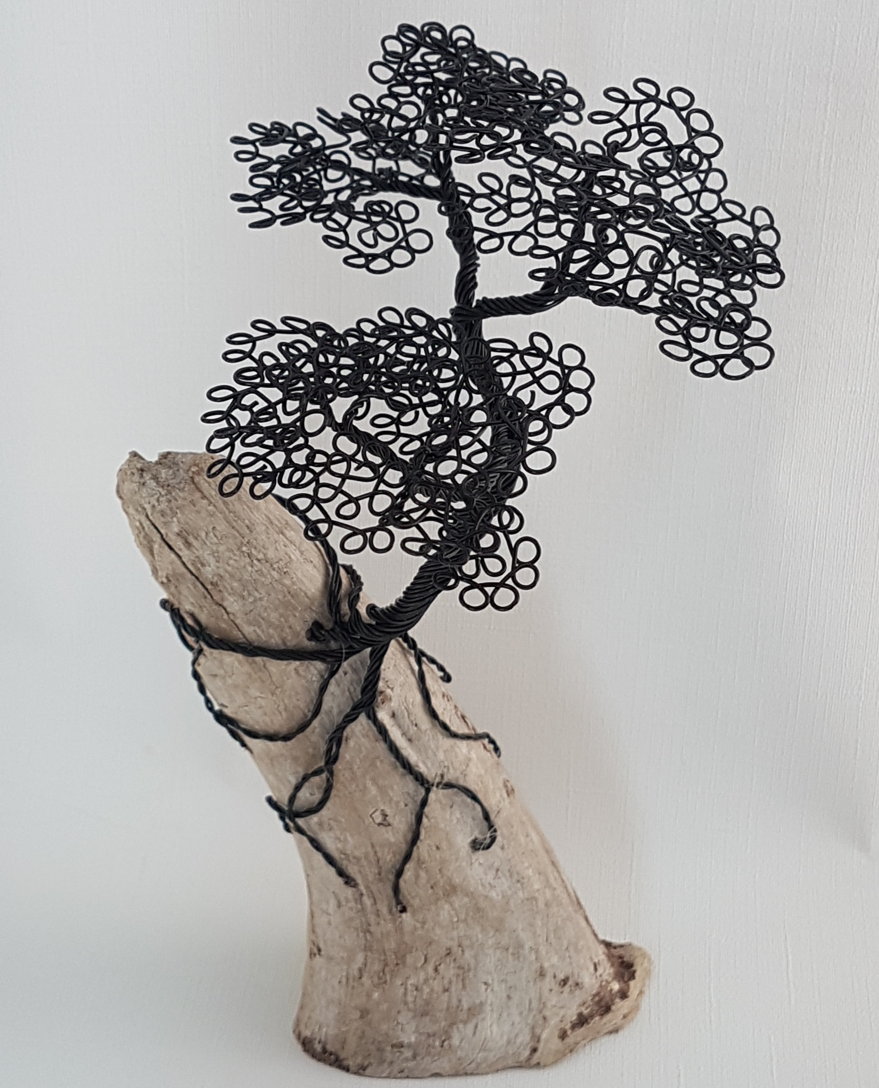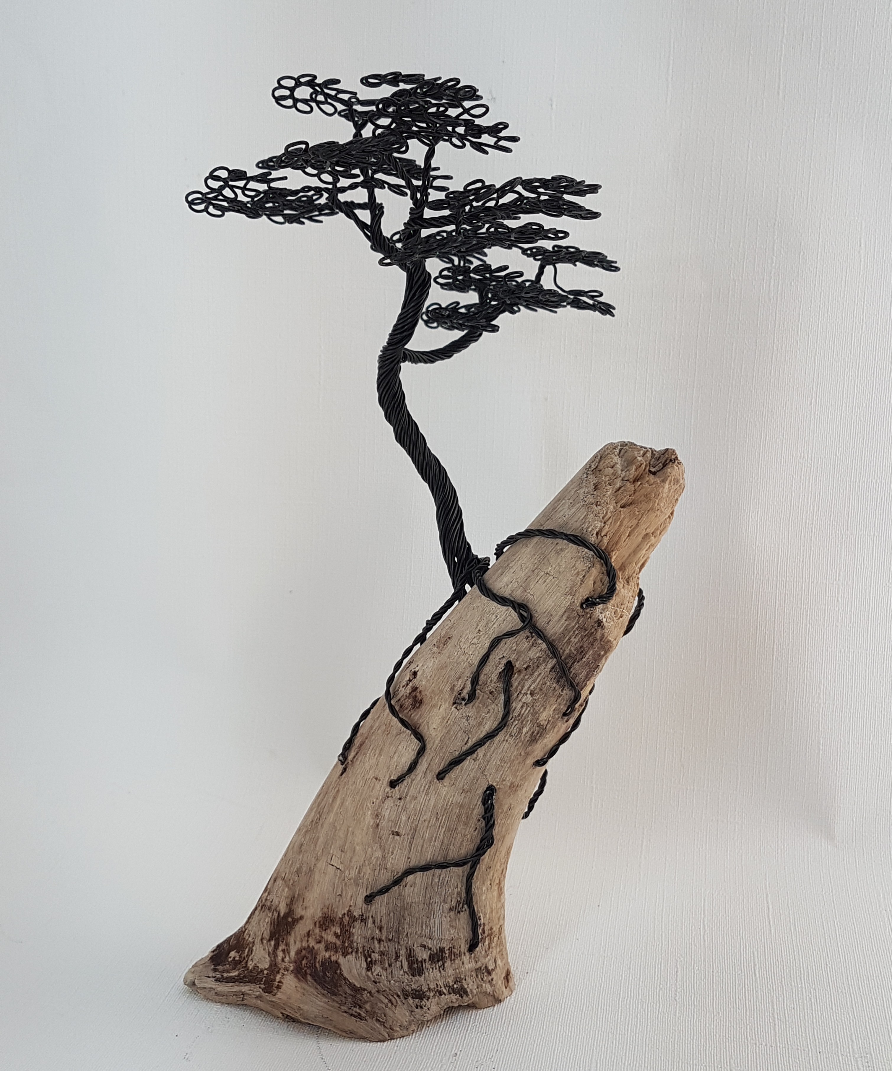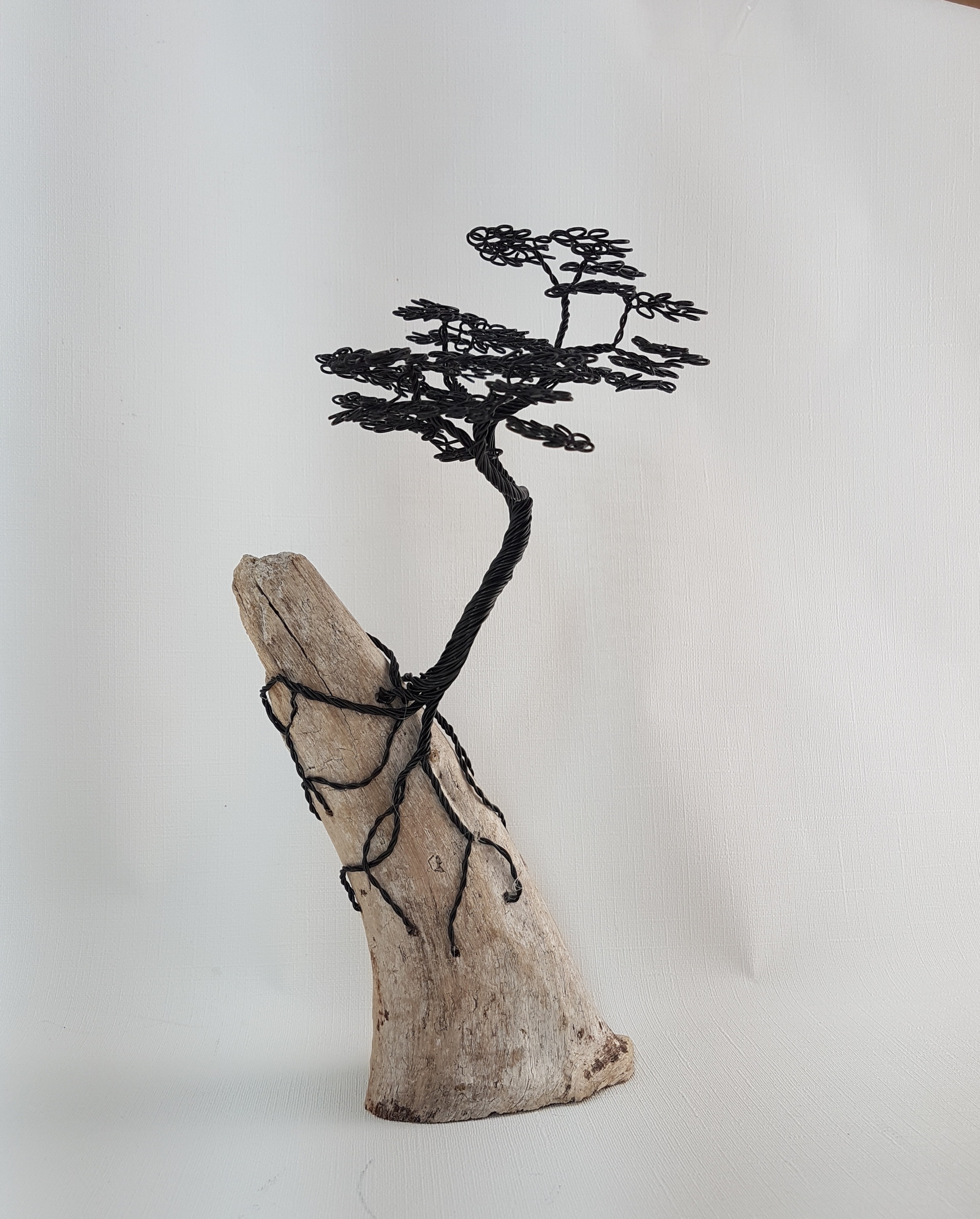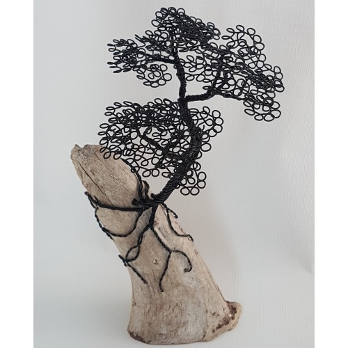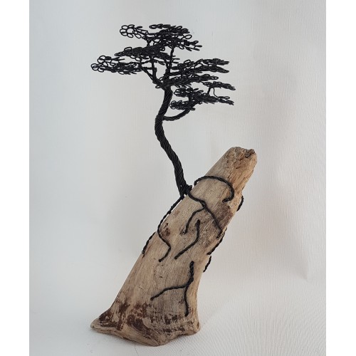 Un arbre élégant par sa position sur son bois flotté naturel beige clair en forme d'éperon.