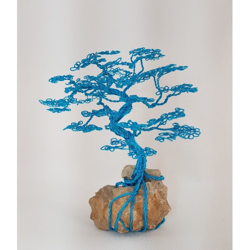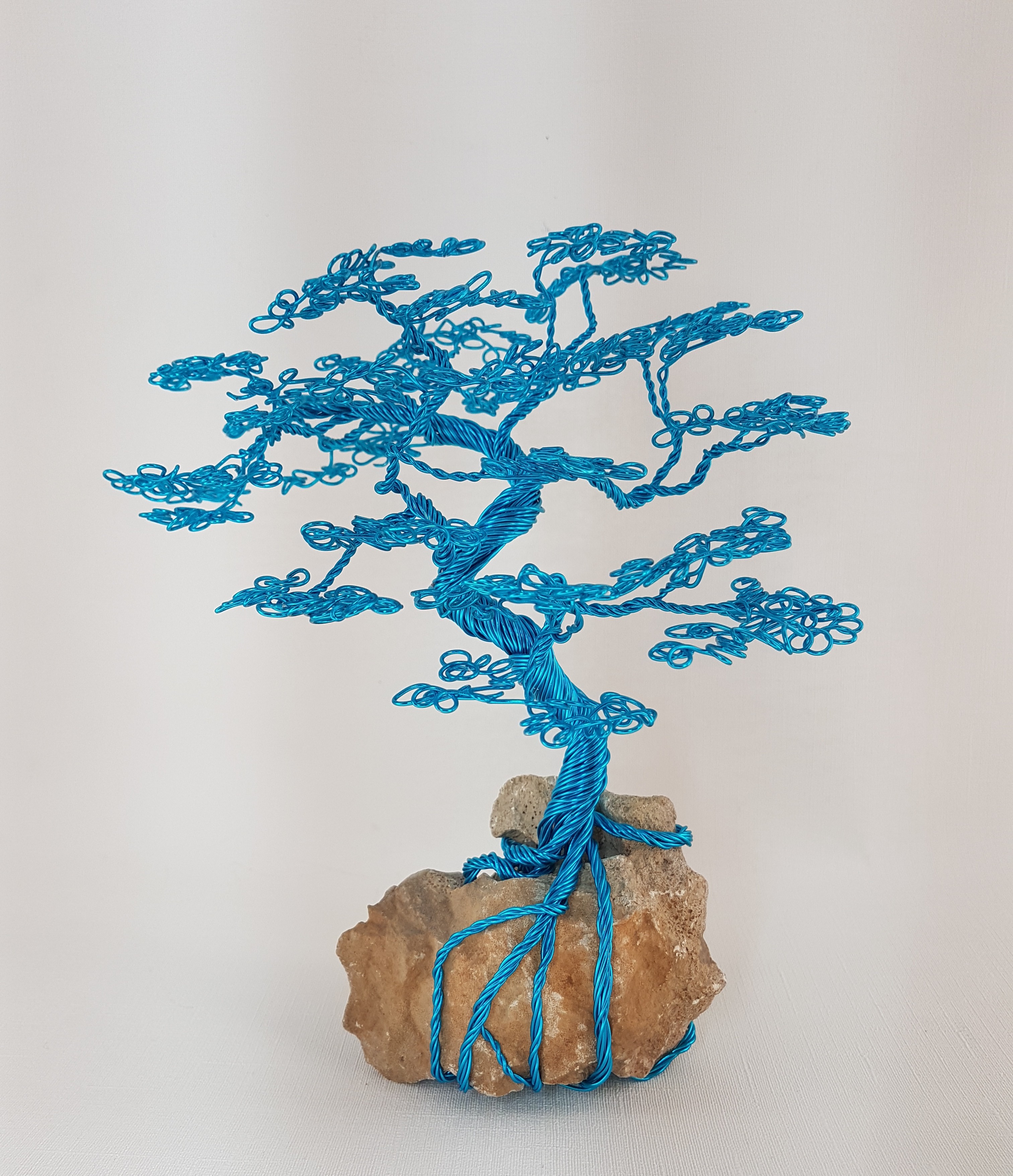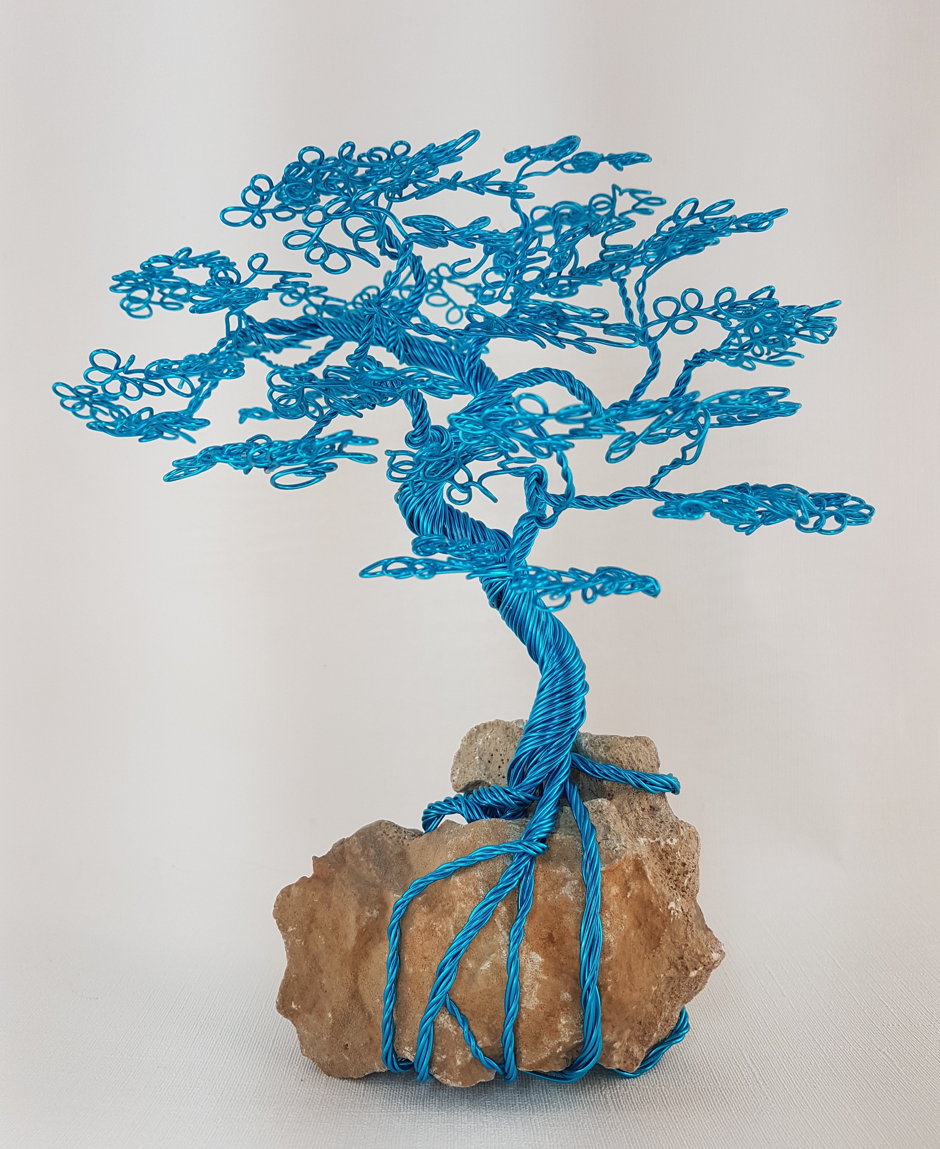Très originale cette belle couleur turquoise brillante pour un bonsaï haut, trapu, installé sur un caillou plein de jolis trous ronds dans lesquels filent ses racines.