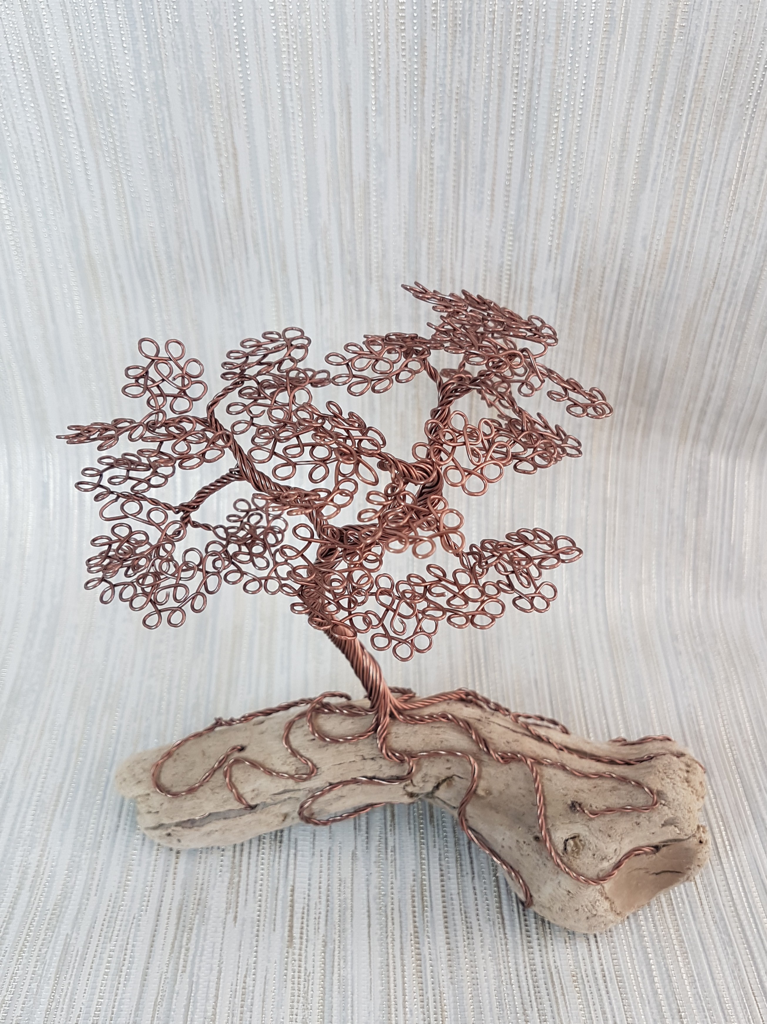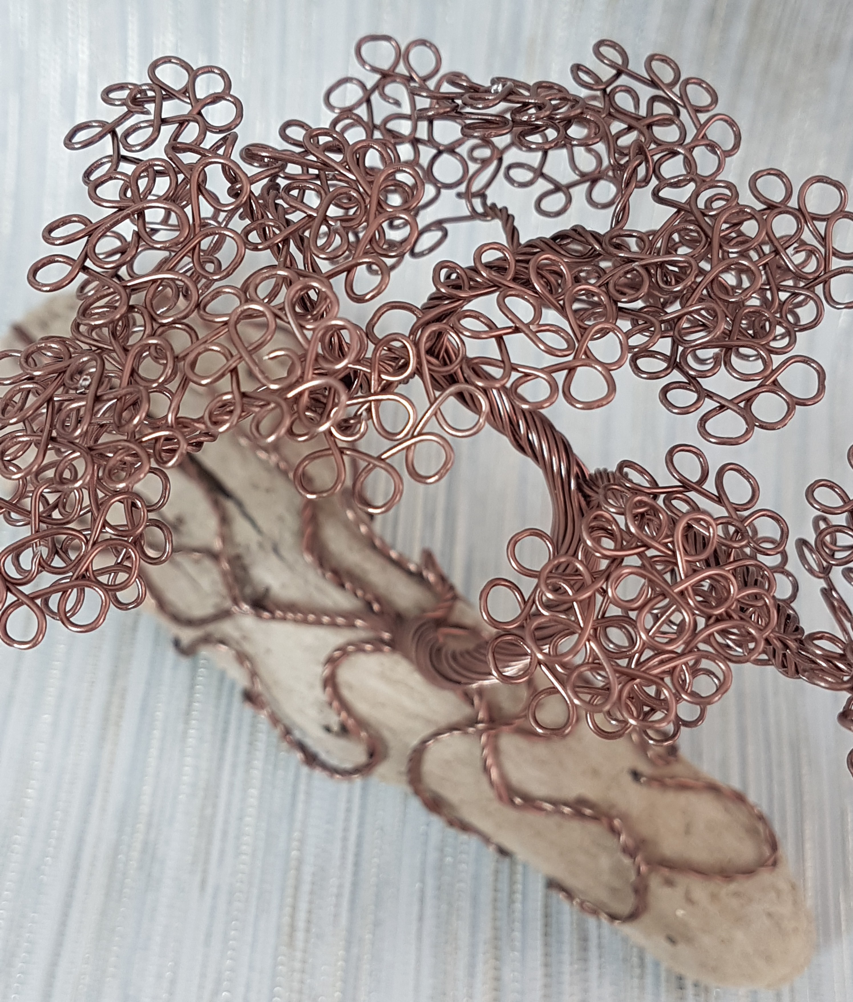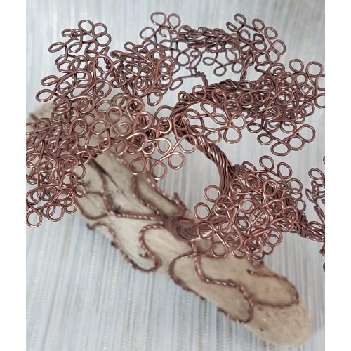 Plein de petites boucles rondes. Sa couleur est très douce et en harmonie avec le bois flotté naturel gris beige sur lequel courent ses racines.