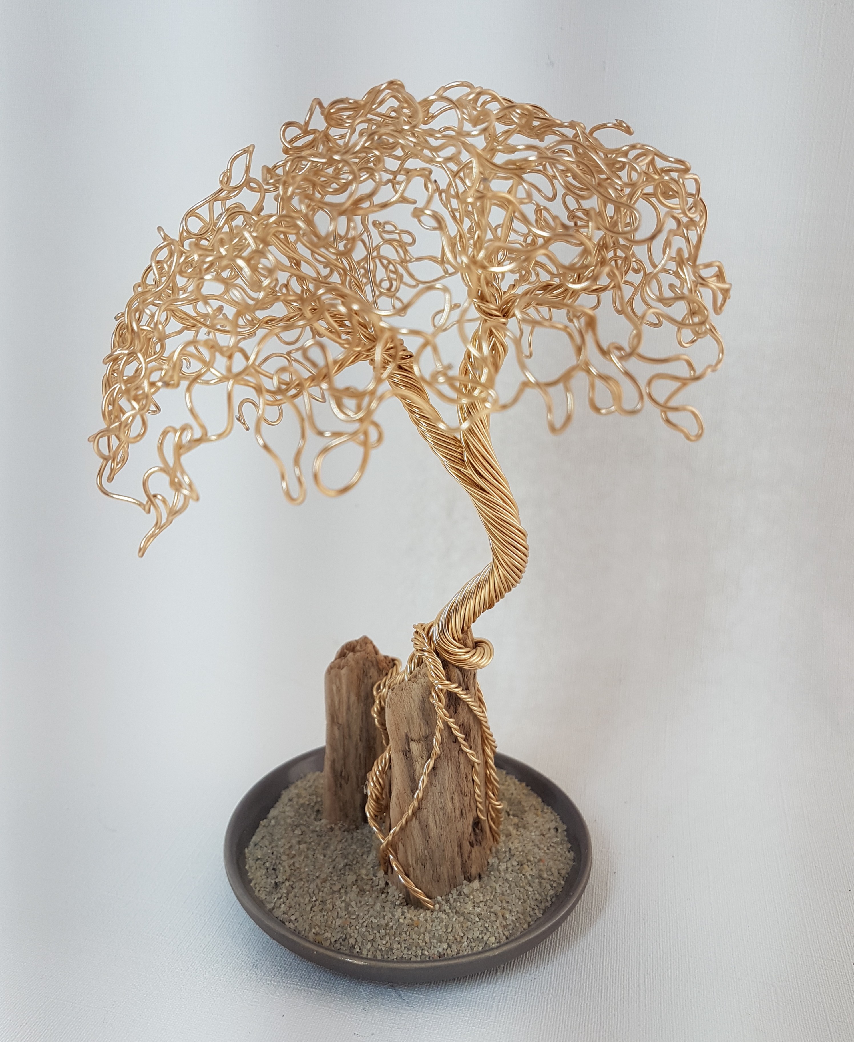 Sa couleur beige doré lui donne un petit effet précieux. Les boucles irrégulières et espacées laissent paraître les branches et le tronc qui s'enracine en haut d'un bois flotté naturel beige.
