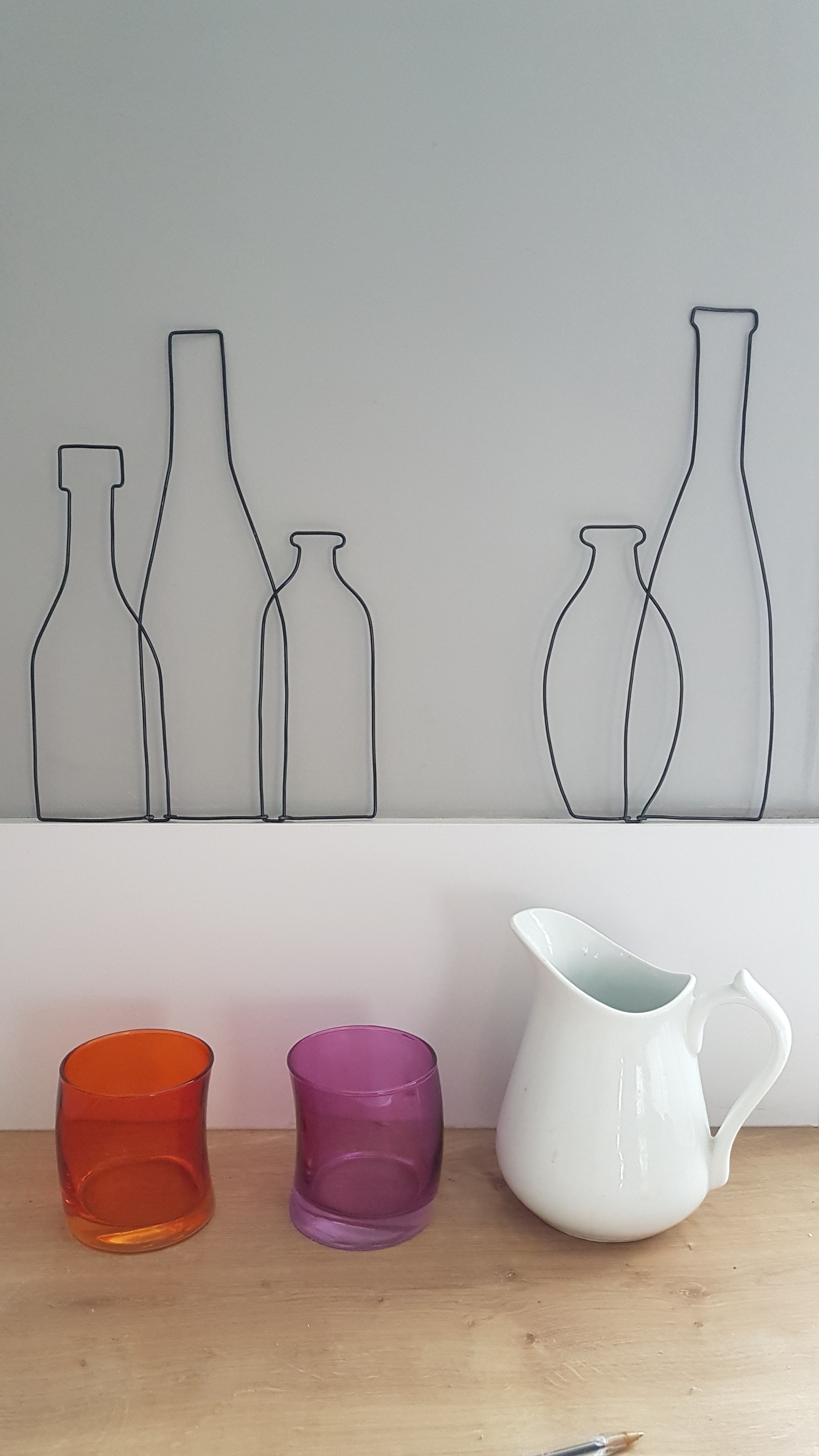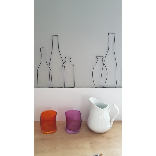 Joli ensemble de 5 bouteilles à disposer selon vos envies. Réalisées à la main, modèle unique, en fil de métal noir.